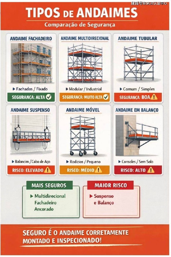 安全不是那种脚手架,而是根据NR-18,经过专业培训的工人和防护装备正确组装、固定、检查和使用的脚手架。